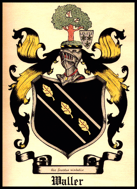 Description of Coat-of-Arms: To the former bearing of the family consisting of "a shield sable; three walnut leaves, or, between two bandlets, argll- -an addition was assigned by Henry V of England, to Sir Richard, in honor of his heroic achievements, viz.: "A walnut tree proper; on the sinister side, an escutcheon pendant, charged with the arms of France (3 fleurs-de-lis), with a label of three points white, and the motto "Hic fructus virtutis."